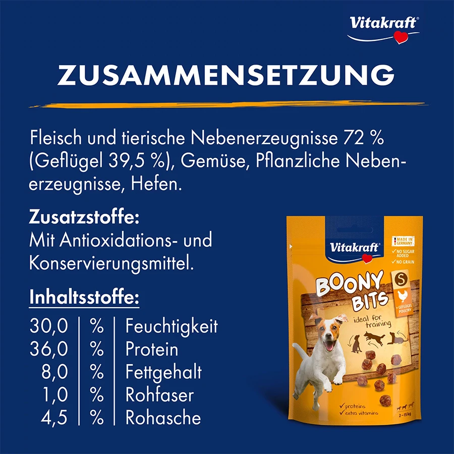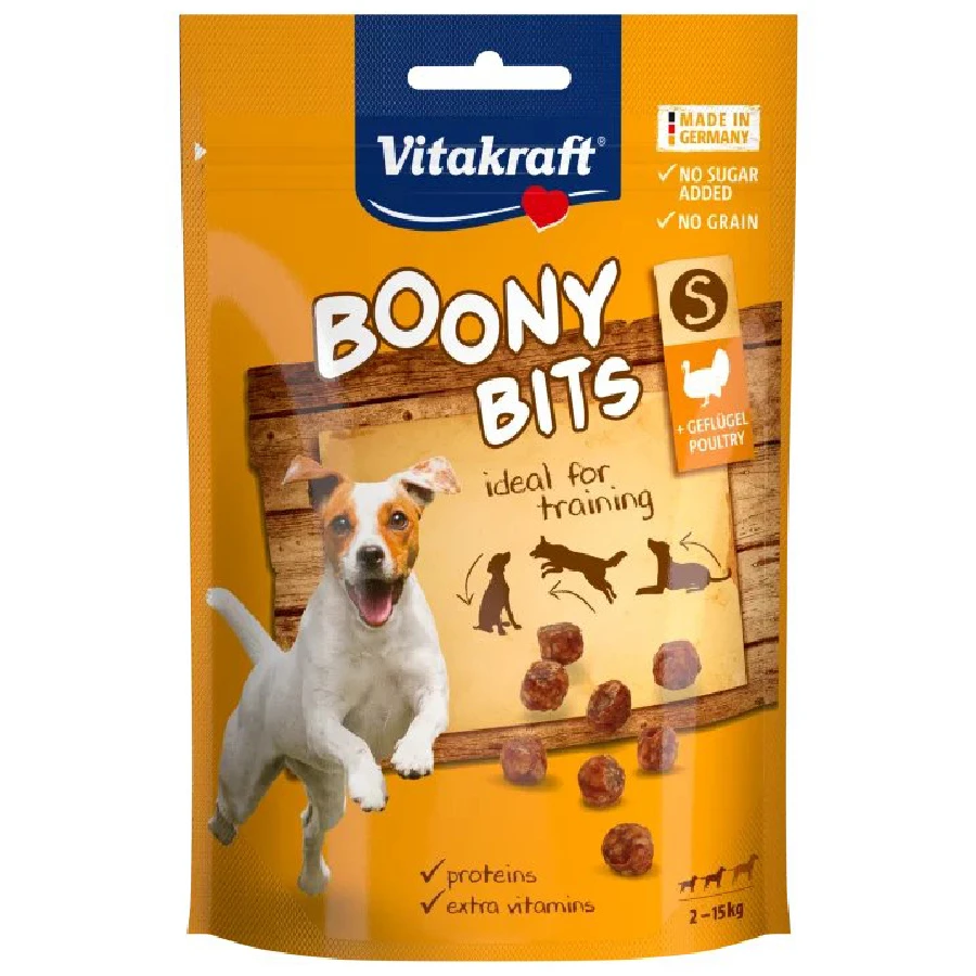 Екстра малите Boony Bits не се само неодолив подарок за мали кучиња, туку се и одлична ужина за тренинг. Можете да го мотивирате или наградите вашиот четириножен пријател до 200 пати – без месните мини закуски непријатно да се распаѓаат или да остават масен остаток во вашиот џеб. Boony Bits се направени без додаден шеќер и ги содржат потребните витамини.